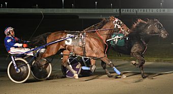Leaving from post four, Baker swooped forward with Allindotime and hugged the cones while 2-1 favorite Buzz (Andrew Adamczyk) barreled to the fore from post eight. Buzz bobbled stride and briefly galloped into the backstretch, forcing Raceace (Alan Schwartz) three wide and leaving Allindotime snug on the lead to a :28.1 first quarter.