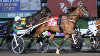 Just before cornering for home, Svanstedt angled Call Me Goo off the pegs to take her shot at Nelsonbriteagle NO, and the 5-year-old Googoo Gaagaa-Callmemza mare edged to the lead just inside the eighth pole — but she was far from home free. As Call Me Goo gradually widened her advantage in deep stretch under a Svanstedt hand drive, 51-1 shot Bravo Angel S (Jason Bartlett), who had stalked from fifth for most of the mile, emerged rapidly up the pegs in deep stretch but came up a nose short despite a :26.1 sprint home. Nelsonbriteagle NO was a beaten third, 1-1/4 lengths in arrears.
