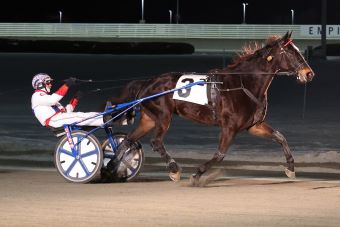 John Calabrese later turned away all foes with a 2:01.1 pillar-to-post performance by odds-on favorite I’m Out. Calabrese zipped from the pylon post to the fore heading to a :29.1 first quarter while Muscle Dan (Tony Ciuffetelli) tried for a seat from an outside draw but raced stuck on the rim.