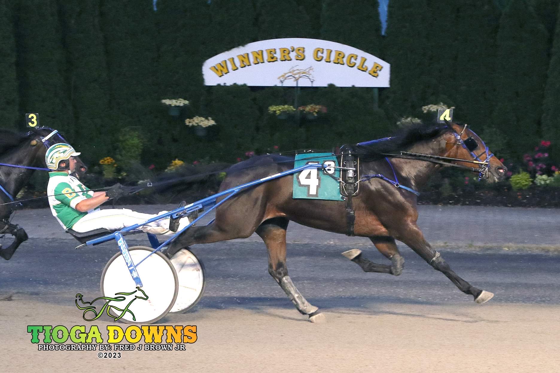 On June 24, Doc Nixon made his second appearance at Tioga Downs with Aaron Byron in the bike. He got away fifth from post four, continuing fifth through the quarter in :29.2 and half in :59.3. Byron pulled his right line and made a first-over trip through the three-quarters in 1:29. Around the final turn, Doc Nixon took over and continued down the stretch to a 1-1/2 length victory in 1:59, a last quarter in :28.4.