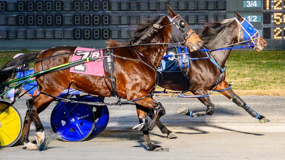 Steven’s Saloon moved to the outside at the three-eighths marker and inched his way up, parked out and coverless past the half. Itsrockanroll A continued to lead up the backstretch. Steven’s Saloon drew alongside. Both pacers prepared to do battle and swords were drawn approaching the three-quarter pole. Downers Delight was content to watch the battle from the pocket.