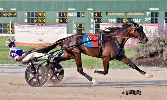 Judy’s Moni won the fifth and last division by a length in 1:57.2. Brett Miller got the Ready For Moni filly away fourth from post six but after the :30.1 opening quarter, moved to the front, was pushed three-wide coming under the line for the first time and made front to lead through the :59.2 half and 1:28.2 third-quarter. Coming home in :29, Judy’s Moni held off Mockingbird As (Noble). Hill On Heels (Ty. Smith) was third. Judy’s Moni is owned by Thestable Judys Moni and came into the race with two qualifiers, one at Northfield and one at The Meadows. Judy’s Moni was a $12,000 Blooded Horse Sale purchase last August.