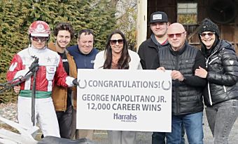 Chester, PA — Driver George Napolitano Jr. became only the eighth North American driver to record 12,000 victories in his sulky career by guiding Pencils Down to victory in the second race at Harrah’s Philadelphia Sunday afternoon (Dec. 24).
