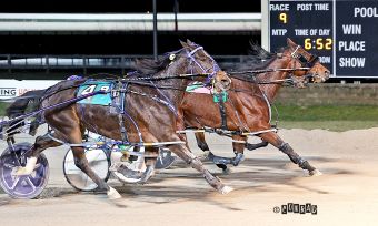 As his cover began to tire, Oakwood Heymiki IR was sent three-wide in the final turn to get into position. The top trio – Gorgeous Big Guy on the inside, Little Rocket Man on the outside and Oakwood Heymiki IR in the middle – paced as a team in the lane. The Irish bred got up in the final strides to record the nose victory over Little Rocket Man and Gorgeous Big Guy in 1:52.2. The 5-year-old son of Always B Miki has now won five straight races for the Royal Wire Products and trainer Robert Cleary.