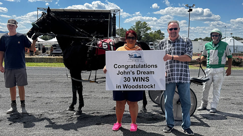 Woodstock, VA — Twelve-year-old gelding pacer John’s Dream, the winningest harness horse ever in Woodstock, Va., got his 30th local win during Thursday’s (Aug. 28) Shenandoah County Fair race card.