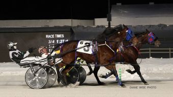 Northfield OH– Lady Rita and Aaron Merriman didn’t complicate things on Saturday evening (Jan. 31). The mare fired to the front before they were off the straightaway heading into turn one. After taking control immediately she led the field single file for nearly 5/8ths of a mile. The sustained pressure for the remaining 3/8ths of a mile came from her stablemate Jumpingjoy N (Chris Lems). Jumpingjoy N and Lady Rita battled side by side for the final strides but ultimately ‘Rita’ dug in to win her third consecutive Filly and Mare Open Pace.