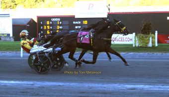 Later in the $22,500 upper-level conditioned trot, Bill Bauer (Nick Graffam) got away last as Ikon Vang DK (Brett Beckwith) cut quarters of :27.4, :56 and 1:26.2. At three-quarters, Bill Bauer was still sixth and third-over in the outer flow led by Murial (Bruce Ranger), who pushed Ikon Vang DK all the way to the stretch. When they straightened for home, Bill Bauer was in the middle of the racetrack passing everybody and flew to the line first by a quarter length in 1:55.3.