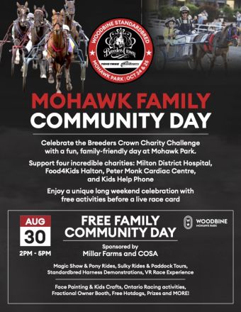 Milton, ON – Woodbine Mohawk Park is set kick-off the 2025 Breeders Crown Charity Challenge and lead up to harness racing’s year-end championship with a free Family Community Day this Saturday (Aug. 30).