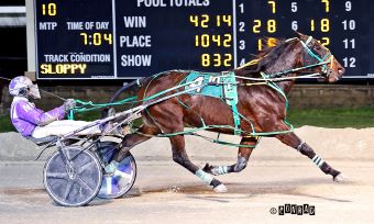 Sarasota Hanover (Luke Hanners) led the field of seven through the fractions of :26.4, :57.1 and 1:26.1. Tie The Knot (David Miller) pressured the leader down the backstretch. The eventual winner was sent three-wide around the final turn and swooped past the tiring leaders. Northern Storm outsprinted Nebble Hanover (Luke Plano) and Mel’s Vicki Lou (Josh Sutton) in the lane to record the 1:56.1 upset.