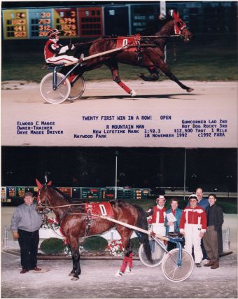 Another “Magee” in nature that will be honored is the horse R Mountain Man, who will be inducted into the Wisconsin Harness Racing Hall of Fame. Have you ever had that “one-in-a-million” horse? Elwood Magee had that horse, although he didn’t start out that way. On March 3, 1987, R Mountain Man made his arrival. He was a home bred colt out by Marburg Hanover and Ponytail. He was named after Elwood and Elva Magee’s third son Randy who, at the time, lived in Colorado.