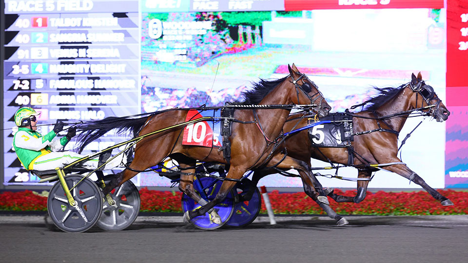 Louis-Philippe Roy hustled Fabulous Hanover to the fore out of post five and cut a :26.4 first quarter to take the lead. As Roy steadied the tempo in the backstretch, 3-5 favorite Naughty Delight swung out of fourth and gutted forward first-up to grab control through a :55.2 half. Naughty Delight carried her speed through the turn to clock three-quarters in 1:23.3 while Twin B Fierce pushed uncovered on the rim with 8-5 second choice Daya on her back.