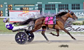 In the other $65,000 division for colts and geldings, Big Ranger stayed perfect in his young career, winning in 1:54.2. Ronnie Gillespie had the Next Generation winner sitting third while watching Where Theres Smoke (Sam Widger) set fractions of :27, :56.1 and 1:24.3. Tipping out down the backside and going three-wide momentarily into the last turn, Big Ranger got by in the final strides to win by a three-quarters of a length. Where Theres Smoke was second, with Rose Run Banker (Chris Page) getting up for third.