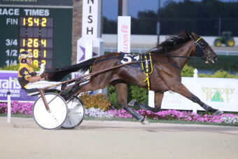 Euguene The Genius tipped off the cones turning for home, reaching the leader’s wheel as the two raced well clear of the rest with an eighth of a mile to go. Trotting home smartly in :27.1, Euguene The Genius surged by Starlitfranknstein late in the lane to cross the wire 2-1/4 lengths clear in 1:54.2. Starlitfranknstein finished second, Kody Kickstand (Ricky Macomber Jr.) finished third.