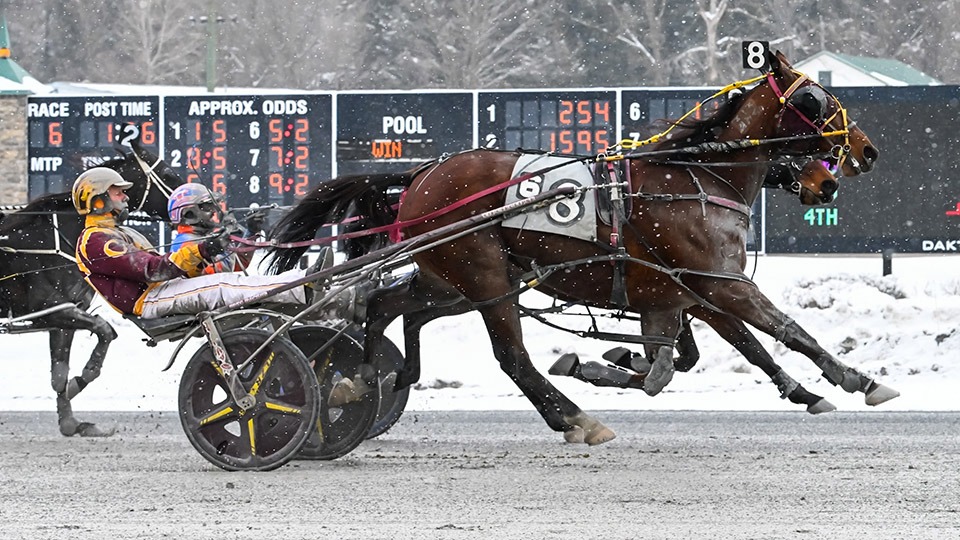 The 7-year-old mare continued to battle overland before tipping to the far outside around the final turn and powering up to get by Waitforever N (driven by Leon Bailey) in the final strides and win in 1:57.