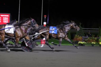 Leaving from post 2, Bartlett slid behind stablemate Apex as the field nestled into order behind post-10 starter Mr Big Spender and Kingmen, who were the only pair to launch off the gate. Mr Big Spender cleared the lead to a :28.4 first quarter and coasted up the backstretch while Apex gradually angled outside from third approaching a :57.4 half. Spencer Hanover followed suit and advanced through the last turn perched behind Apex as he hooked into battle with Mr Big Spender passing three-quarters in 1:25.