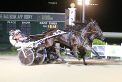 Atlee Bender wheeled Jada Caroline out from third on the backstretch, taking command from Lyin’ Eyes just beyond the half which was timed in :57.1. Entering the final turn, Teelatini flushed the cover of even-money favorite Lets Go Endofaera (John De Long) who led the charge first-over while Jada Caroline brought the field to three-quarters in 1:24.3.