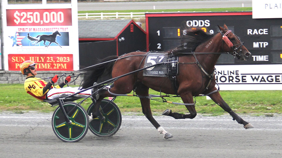 Plainville, MA — After never being in contention from an impossible spot last week, Therewasthisgirl bounced back in a big way to win the $25,000 Winners-Over pacing feature for fillies and mares at Plainridge Park on Tuesday afternoon (Oct. 10).