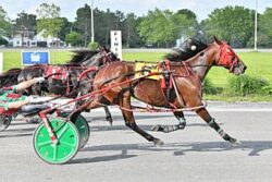 The Deslandes clan roster was as hot as the 90 degree forecast on Wednesday as three winners from the meet’s leading stable blazed around the Queen City oval led by Swellendam (1:55.3-$11.40) who spun together identical :57.4 front and back halves to persevere by a neck at the wire. The win was the fourth of the season and represented a seasonal mark for the 10-year-old veteran son of Bettor’s Delight who is owned in partnership by Steven Blood and Dan Deslandes.