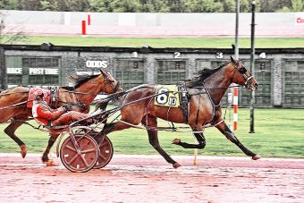 Ooglesaurus and Twin B Thriller had won in each of the first two Weiss prelims; last week Ooglesaurus took off while Twin B Thriller had his misfortune. In the championship, Twin B Thriller, starting in post six just outside of his fellow double winner, was the co-second choice, and after making the early lead, kept his favored opponent outside to a :27.2 quarter. His big foe having been cleared (although not without a couple of fumbly steps), Twin B Thriller kept going right down the road for driver George Napolitano Jr., putting up midsplits of :56.3 and 1:23.4.