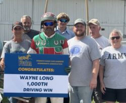 Meadville PA — “Youthful veteran” horseman Wayne Long drove career winner number 1,000 during Friday’s (July 5) racing for 2-year-olds at a two-day Pennsylvania Fair Sire Stakes meet at the Crawford County Fairgrounds in this northwest Pennsylvania city.